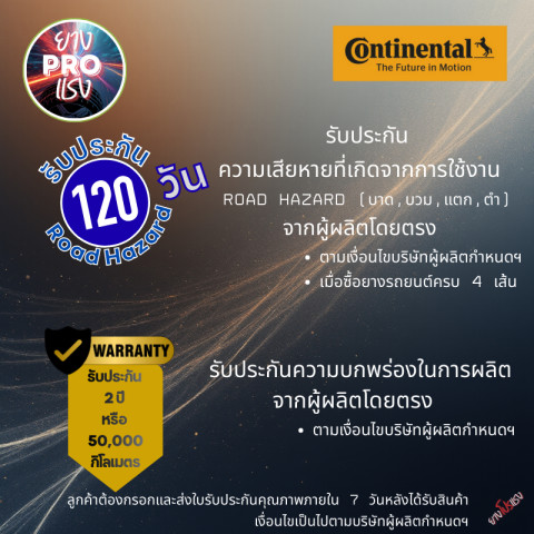 รับประกันความเสียหายจากการใช้งานจริงแบบ Road Hazard (บาด, บวม, แตก, ตำ) ตามเงื่อนไขผู้ผลิต