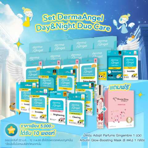 [SET Special 5,000] DermaAngel Day & Night Duo Care เซ็ตดูแลสิวครบจบทั้งกลางวันและกลางคืน รวมไอเทมแผ่นแปะสิวเดอร์มาแองเจิลหลากหลายสูตรและหลายขนาด ให้คุณเลือกใช้ได้ตรงจุด ไม่ว่าจะเป็นการปกปิดสิวระหว่างวัน ดูแลสิวยามพักผ่อน หรือแปะสิวหัวใหญ่แบบเร่งด่วน พร้อมของแถมสุดคุ้มในกล่องเดียว