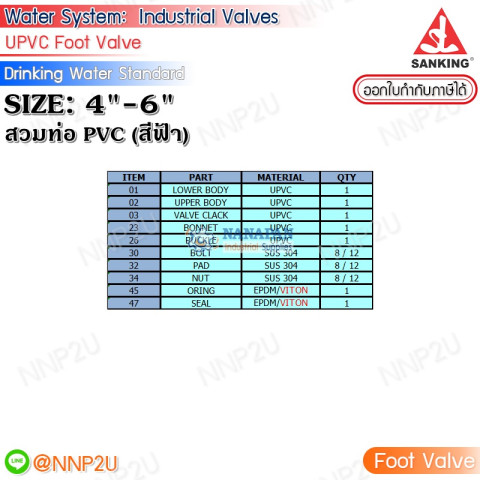 SANKING สวิงฟุตวาล์ว UPVC (Swing Foot Valve) แบบสวม (ท่อ PVC สีฟ้า) ขนาด 4", 6" ราคา 18,725.00 บาท