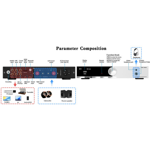 อินพุต: USB, Bluetooth (LDAC/aptX HD), Optical, Coaxial, HDMI (ARC), Phono (MM), Line