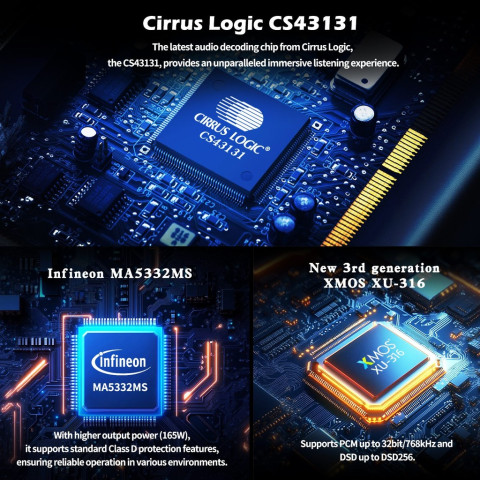 ภาคขยายดิจิตอล Infineon MA5332MS (Germany) ให้กำลังขับสูงถึง 165W × 2 ที่ 4Ω พร้อมความเพี้ยนต่ำสุด THD 0.003% ถ่ายทอดเสียงชัด คุมเบสอยู่มือDAC คุณภาพสูง รองรับไฟล์ระดับสตูดิโอ