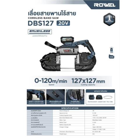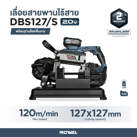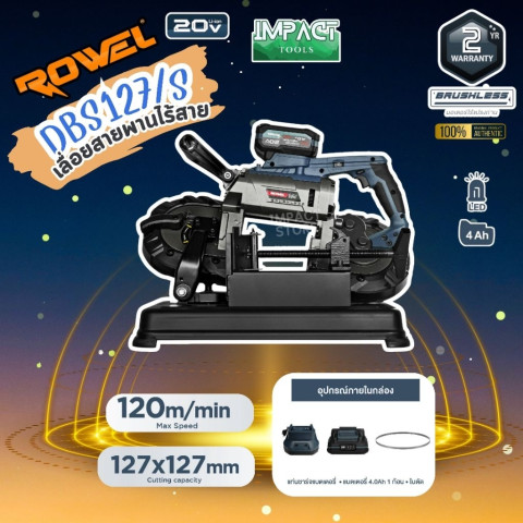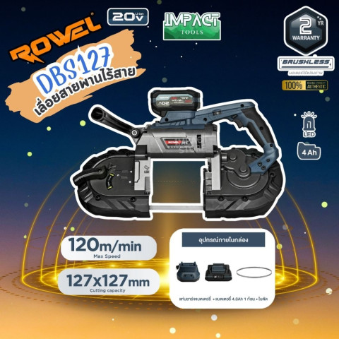 ROWEL เลื่อยสายพานไร้สาย รุ่น DBS127 ขนาด 5 นิ้ว (ครบชุดพร้อมใช้) พลังตัดเต็มกำลังด้วยระบบ 20V และ Brushless Motor ให้แรงสม่ำเสมอ ทนทาน ใช้งานคล่องตัว เหมาะทั้งงานช่างมืออาชีพและงานซ่อมบำรุงทั่วไป มาพร้อมอุปกรณ์ครบชุด แบตเตอรี่ 4Ah และแท่นตัดพร้อมเริ่มงานได้ทันที