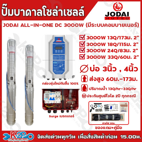 JODAI ปั๊มบาดาลโซล่าเซลล์ รุ่น ALL IN ONE DC 3000W (มีระบบคอมบายเนอร์) ทางเลือกสำหรับการสูบน้ำบาดาลแบบประหยัดพลังงาน ใช้งานกับระบบโซล่าเซลล์ได้อย่างลงตัว มาพร้อมกล่องคอนโทรลแบบ All in One ที่รวมอุปกรณ์สำคัญครบ ทั้งคอมบายเนอร์ เบรกเกอร์ และระบบป้องกันไฟกระชาก (Surge) ต่อสายพร้อมใช้งานได้ทันที เหมาะสำหรับลงบ่อขนาด 3 นิ้ว / 4 นิ้วขึ้นไป และรองรับท่อน้ำออก 1.5 นิ้ว / 2 นิ้ว
