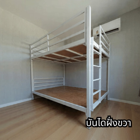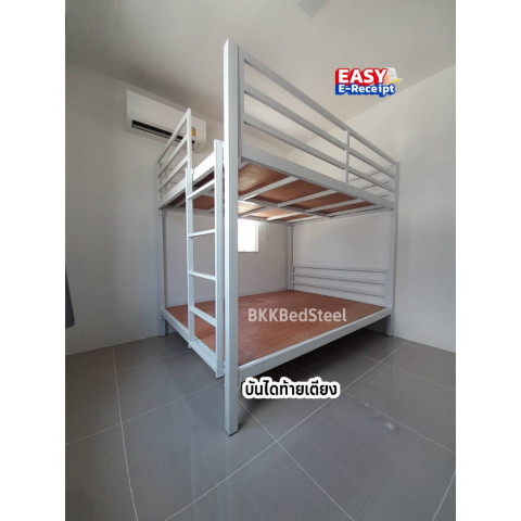 เตียงเหล็ก 2 ชั้น พร้อมบันไดปีนท้ายเตียง และกันตกรอบเตียง แข็งแรง ทนทาน เหมาะสำหรับบ้าน หอพัก ห้องนอนเด็ก/ผู้ใหญ่ หรือพื้นที่ที่ต้องการประหยัดพื้นที่ ใช้วัสดุเหล็กกล่องขนาด 2x2 นิ้ว หนา 1.2 มม. มั่นใจเรื่องโครงสร้าง รองรับการใช้งานได้ดี พร้อม ไม้รองเตียง ใช้งานได้ทันที
