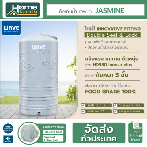 ถังเก็บน้ำ Wave รุ่น JASMINE (จัสมิน) ขนาด 1000-2000 ลิตร ตัวเลือกถังเก็บน้ำคุณภาพสำหรับบ้านและอาคาร ที่ให้ความมั่นใจทั้งความสะอาด ความทนทาน และการใช้งานระยะยาว มาพร้อมนวัตกรรมฟิตติ้งลิขสิทธิ์เฉพาะ WAVE ช่วยลดโอกาสรั่วซึม ใช้งานสะดวก ไม่ยุ่งยาก