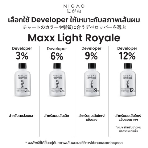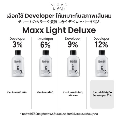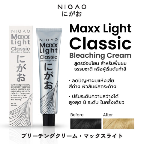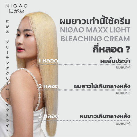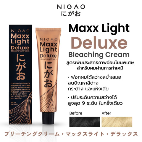 NIGAO Maxx Light Bleaching Cream (นิกาโอะ แม็กซ์ ไลท์ ครีมฟอกสีผม) 100 mL ราคา 152.46 บาท — ครีมฟอกสีผมยอดฮิตที่ช่างและสายทำสีเลือกใช้ ช่วยยกระดับความสว่างของเส้นผมได้ในครั้งเดียว พร้อมเนื้อครีมใช้งานง่าย ให้ผลลัพธ์สีผมที่ดูสม่ำเสมอ ลดโอกาสผมด่าง และช่วยให้การลงสีต่อเป็นเรื่องง่าย