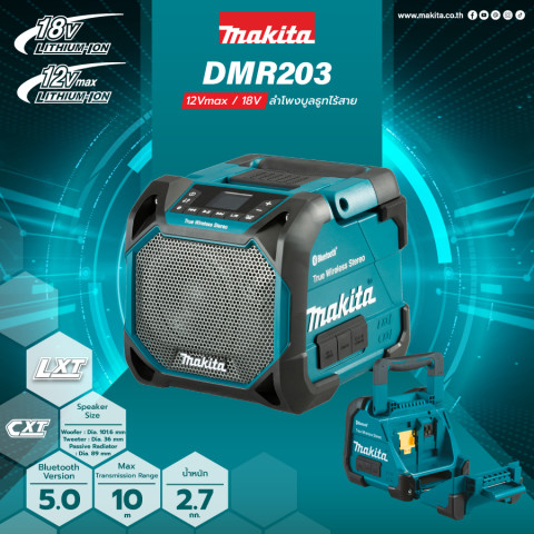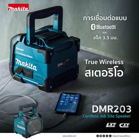 MAKITA ลำโพง Bluetooth AC/DC 12V-18V รุ่น DMR203 + อะแดปเตอร์ AC (3.5W) คือคำตอบสำหรับสายงานช่างและสายกิจกรรมที่ต้องการเสียงคุณภาพในทุกสถานการณ์ ไม่ว่าจะใช้งานในไซต์งาน กลางแจ้ง หรือที่บ้าน ด้วยการรองรับทั้งไฟบ้านผ่านอะแดปเตอร์ AC และแบตเตอรี่ MAKITA 12Vmax-18V (เฉพาะตัวเครื่อง) ให้คุณพกพาความบันเทิงไปได้ทุกที่ พร้อมมาตรฐานกันน้ำกันฝุ่น IP65 และฟังก์ชันเสียงจัดเต็มระดับมืออาชีพ