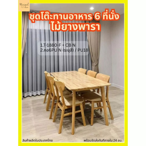 Minimal_deco ชุดโต๊ะทานอาหาร 6 ที่นั่ง ไม้ยางพารา (โต๊ะ 180 ซม. + เก้าอี้ 6 ตัว)