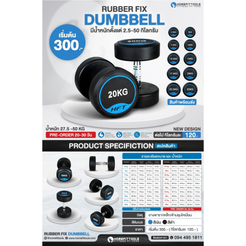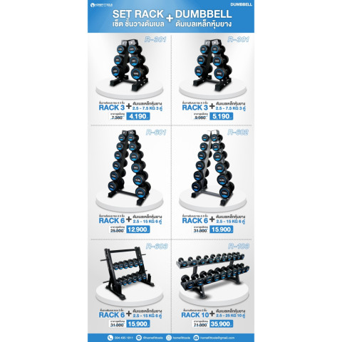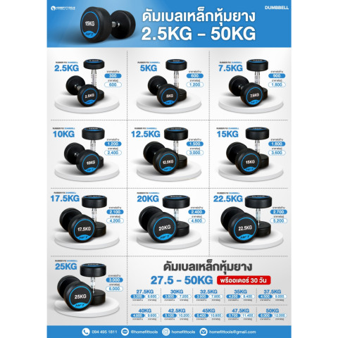 ช่วงน้ำหนักดัมเบล: 2.5 - 25 กก. (เพิ่มทีละ 2.5 กก.) รวม 10 คู่