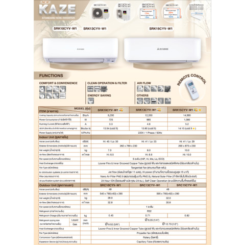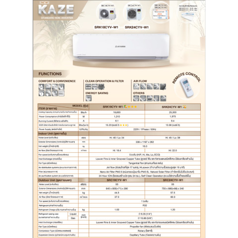 SRK15CYV: 14,580 BTU | SEER 14.10 (เบอร์ 5 1 ดาว) | เหมาะกับห้อง 19-23 ตร.ม.