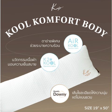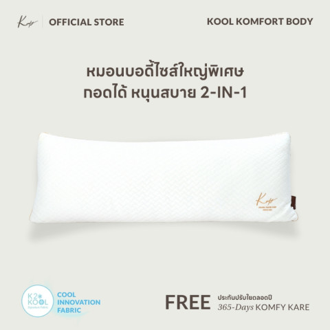 KOMFY หมอนบอดี้ พรีเมี่ยม Kool Komfort Body (5039) ราคา 5,999.00 บาท มอบความสบายระดับไฮเอนด์สำหรับคนรักหมอนข้างตัวใหญ่ ดีไซน์ 2 IN 1 ใช้ได้ทั้ง นอนกอด และ หนุนนอน ในใบเดียว ขนาดจัมโบ้กอดได้เต็มอิ่ม กลิ้งตัวแค่ไหนก็ยังรองรับได้ดี จะนอนเดี่ยวก็ฟิน หรือใช้เป็นหมอนหนุนคู่คนที่คุณรักก็อบอุ่นนุ่มสบายตลอดคืน