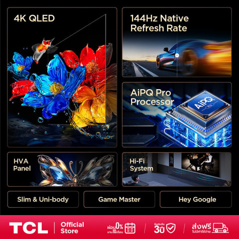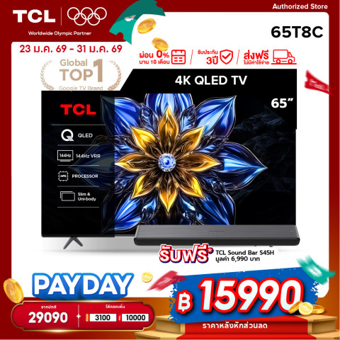 [ฟรี! SoundBar] TCL ทีวี 65 นิ้ว 4K QLED Gaming TV รุ่น 65T8C ยกระดับความบันเทิงในบ้านให้ “สวย ชัด ลื่น” ครบทั้งภาพและเสียง ด้วยจอ 4K QLED ที่ให้สีสันสมจริงกว่าเดิม พร้อมดีไซน์พรีเมียม ไร้ขอบ โทนหรูหราสีทอง ดูโดดเด่นทุกมุมมอง และยังเอาใจสายเกมด้วยโหมด Game Master เพื่อประสบการณ์การเล่นเกมที่ลื่นไหลเร้าใจยิ่งขึ้น