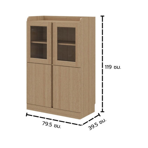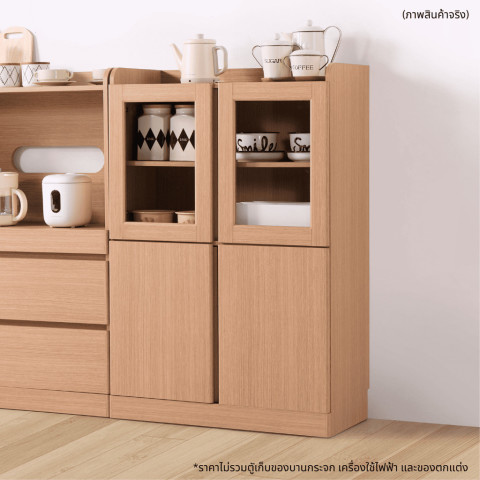 โซนบน (บานกระจกใส): เหมาะสำหรับวางขวดเครื่องปรุง จานสวย แก้วน้ำ หรือของตกแต่งที่อยากโชว์ พร้อมชั้นวาง 2 ระดับเพื่อจัดให้เป็นหมวดหมู่
