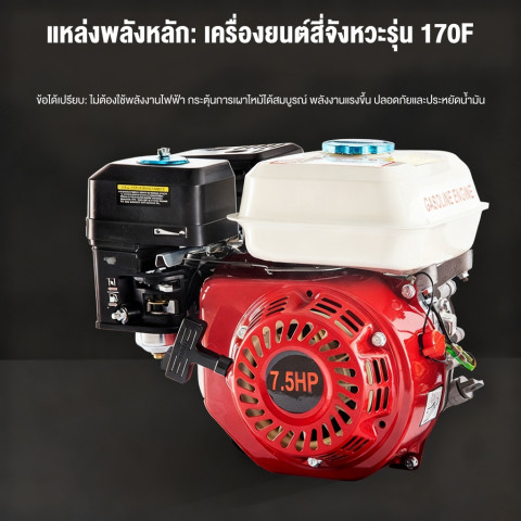 เครื่องยนต์ 4 จังหวะ 170CC สตาร์ทง่าย เดินเครื่องนิ่ง ประหยัดน้ำมันกว่าระบบ 2 จังหวะ และลดปัญหาควัน/กลิ่นรบกวน