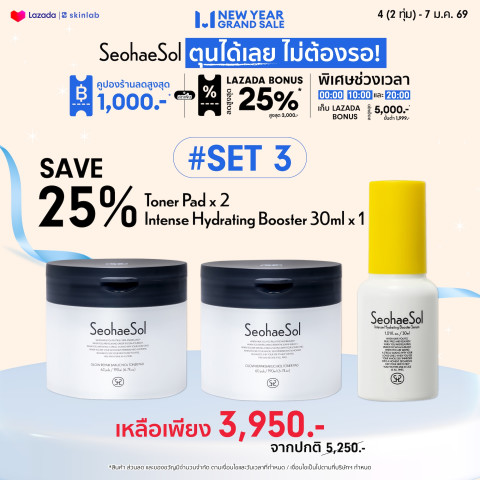 [Special Set 3] Seohaesol Glow Repair Bakuchiol Toner Pad x 2 + Intense Hydrating Booster Serum x 1 คือเซ็ตดูแลผิวที่ออกแบบมาเพื่อผิวที่ต้องการ “ความโกลว์ใส + ชุ่มชื้นล้ำลึก” ในขั้นตอนที่ทำตามได้ง่ายทุกวัน ด้วยโทนเนอร์แพดบาคูชิออล 2 กระปุกสำหรับเช็ดผิวให้เรียบเนียนและเตรียมผิว พร้อมบูสเตอร์เซรั่มเติมน้ำให้ผิวอิ่มฟู 1 ขวด ช่วยให้ผิวดูสุขภาพดี แต่งหน้าติดทน และผิวสัมผัสนุ่มขึ้นอย่างเห็นได้ชัด