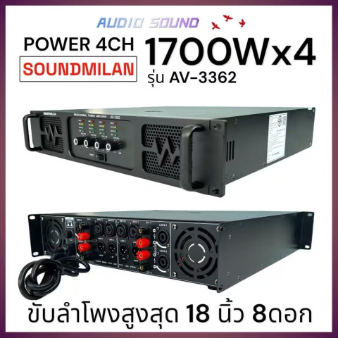 SOUNDMILAN AV-3362 เพาเวอร์แอมป์ 4CH สำหรับงานกลางแจ้งและงานเครื่องเสียงชุดใหญ่ ขับลำโพงได้หนักแน่น ให้พลังสำรองสูง เหมาะกับชุดลำโพง 15 นิ้วหลายดอก ใช้งานได้ทั้งงานเวที งานอีเวนต์ ร้านอาหาร หรือชุดเครื่องเสียงเคลื่อนที่ โดยมาพร้อมการควบคุมแยกอิสระทุกแชนแนลและระบบระบายความร้อนจัดเต็ม เพื่อความเสถียรเมื่อเปิดใช้งานต่อเนื่อง