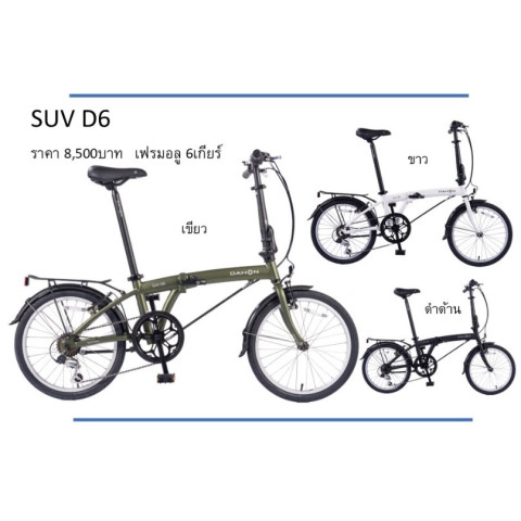 จักรยานพับ Dahon SUV D6 (All New) รุ่นเริ่มต้น เฟรมอลู 6 เกียร์ ในสีขาว ดีไซน์เฟรมโฉมใหม่ล่าสุด ให้ความคุ้มค่าแบบ “ราคาหลักพัน คุณภาพหลักหมื่น” เหมาะทั้งปั่นในเมือง เดินทางไปทำงาน หรือพับเก็บขึ้นรถ/เก็บในคอนโดได้ประหยัดพื้นที่ พร้อมตะแกรงท้ายและบังโคลนครบ ใช้งานจริงจังได้ตั้งแต่วันแรก