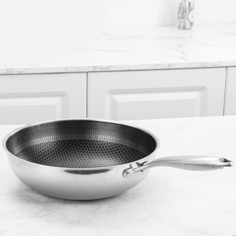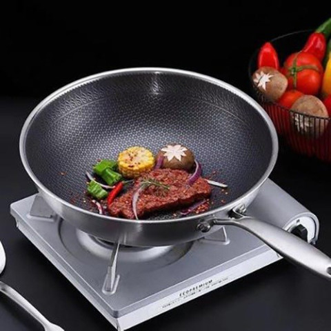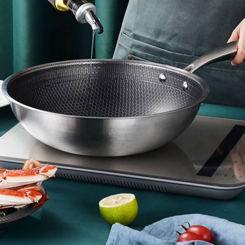 กระทะสแตนเลสรังผึ้ง 32/34 ซม. กระทะควันน้อย ร้อนเร็ว ผัดทอดลื่น ไม่ติดกระทะ ผลิตจากสแตนเลสคุณภาพสูง แข็งแรงทนทาน ใช้งานได้ทุกวัน ตอบโจทย์ทั้งครัวบ้านและทำอาหารปริมาณมากในมื้อพิเศษ