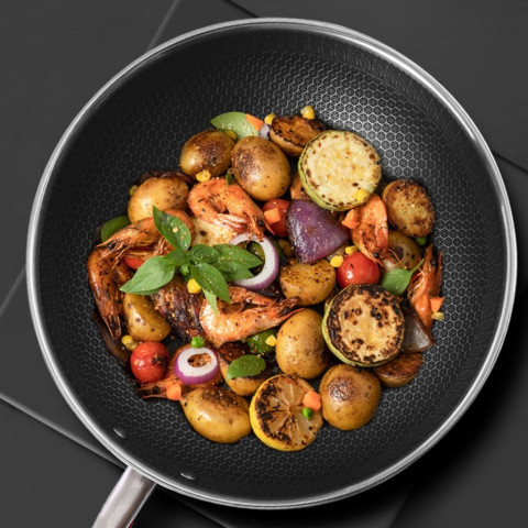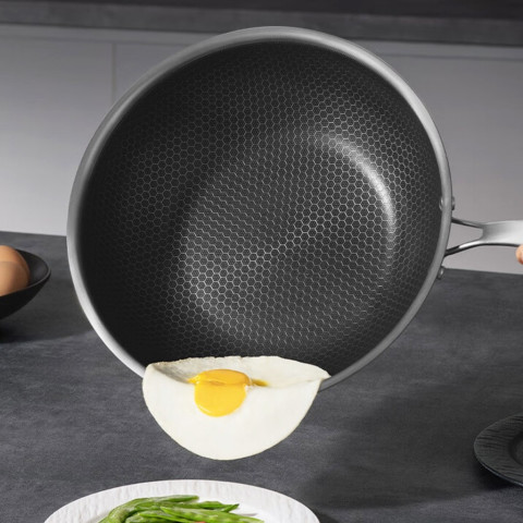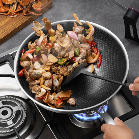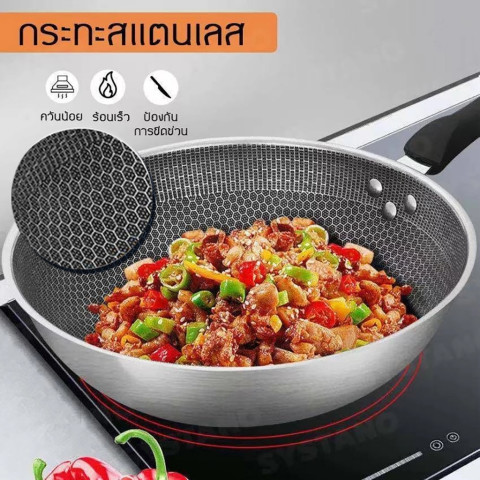 ผิวลายรังผึ้ง ลดการติดกระทะ ช่วยให้อาหารลื่นขึ้น เหมาะกับเมนูผัด/ทอดที่ต้องการไฟแรง