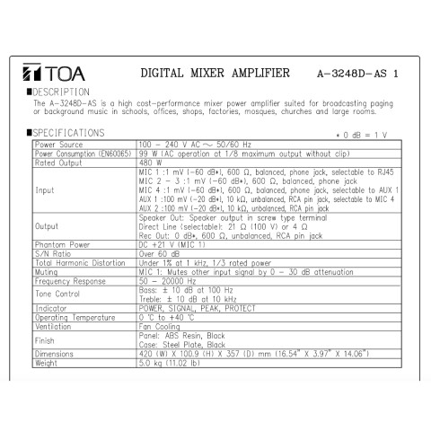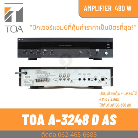 TOA A-3248D มิกเซอร์แอมป์ดิจิตอล 480 วัตต์ 4 Mic 2 Aux คือเพาเวอร์มิกเซอร์แอมปลิไฟเออร์คุณภาพสูงที่ออกแบบมาเพื่อระบบกระจายเสียงและเปิดเพลง BGM ในพื้นที่ขนาดกลางถึงขนาดใหญ่ ไม่ว่าจะเป็นโรงเรียน สำนักงาน โรงงาน โบสถ์ วัด ร้านค้า หรือห้องจัดเลี้ยงขนาดใหญ่ ให้พลังเสียงคมชัด มั่นคง ใช้งานง่าย และคุ้มค่าในราคาเพียง 20,287.20 บาท (ราคารวมภาษีมูลค่าเพิ่มแล้ว)