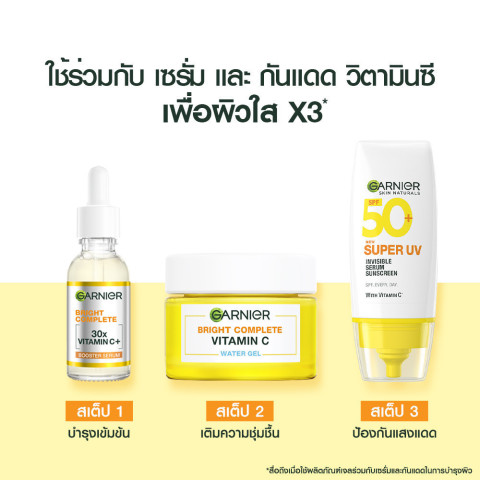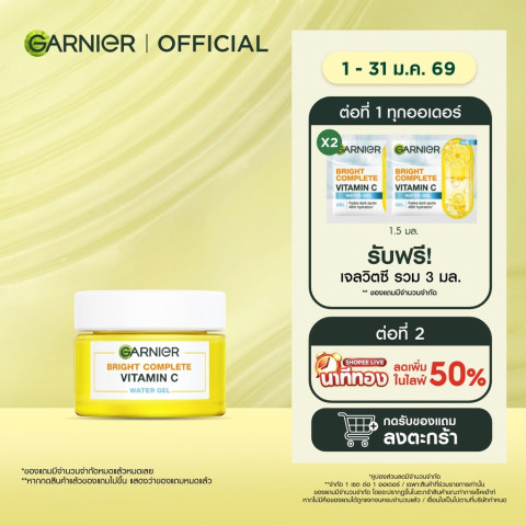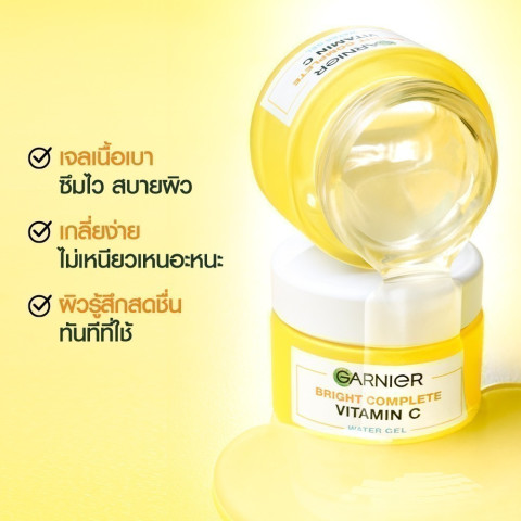 เผยผิวใส อิ่มน้ำ ไร้ความหมองคล้ำด้วย การ์นิเย่ ไบรท์ คอมพลีท วิตามินซี วอเตอร์-เจล 50 มล. (GARNIER VITAMIN C WATER GEL) มอยเจอร์ไรเซอร์เนื้อเจลบางเบาสำหรับทุกสภาพผิว โดยเฉพาะผิวหมองคล้ำและมีจุดด่างดำ ช่วยให้ผิวดูกระจ่างใส ชุ่มชื้นล้ำลึก และสบายผิวตลอดวัน