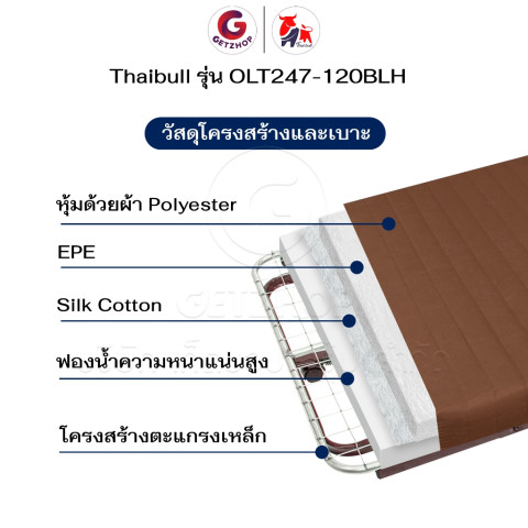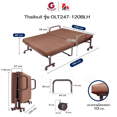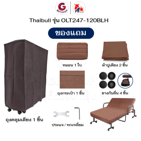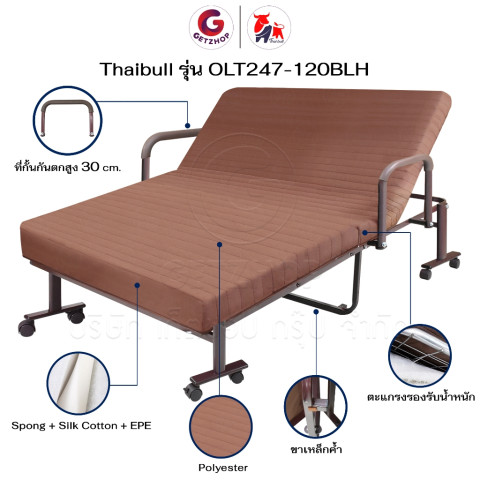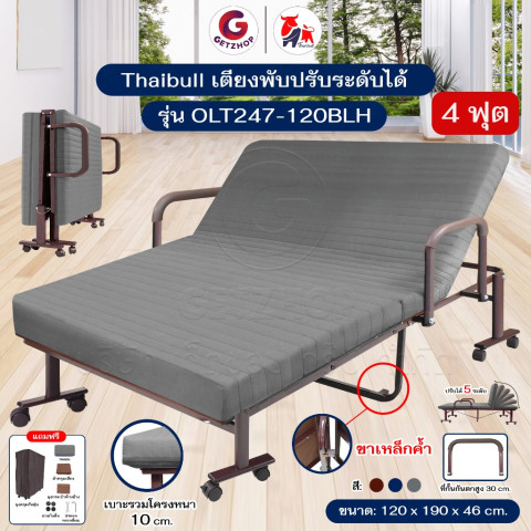 Thaibull เตียงพับ เตียงนอนพร้อมเบาะ 4 ฟุต รุ่น OLT247-120BLH (สีเทา) ทางเลือกที่ลงตัวสำหรับบ้าน คอนโด ห้องพักผู้ป่วย หรือห้องรับแขกที่ต้องการเตียงเสริมใช้งานง่าย—กางเร็ว พับเก็บประหยัดพื้นที่ และยังปรับเอนศีรษะได้ถึง 5 ระดับ จะนอนพักผ่อนจริงจังหรือเอนหลังอ่านหนังสือก็สบาย พร้อม ราวกั้นกันตกสูง 30 ซม. เพิ่มความอุ่นใจ และ แถมฟรีผ้าปูและอุปกรณ์ ให้พร้อมใช้งานทันที
