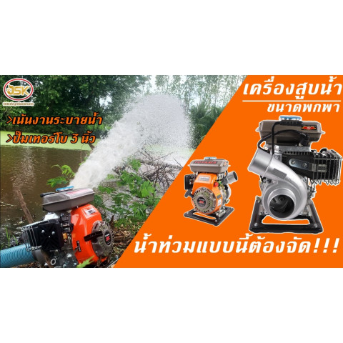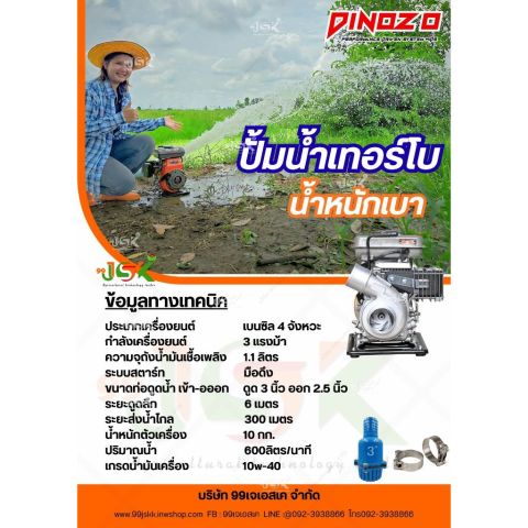 เครื่องสูบน้ำเทอร์โบ DINOZO ขนาด 3 แรง ปั้ม 3 นิ้ว เครื่องสูบน้ำแบบพกพา ขนาดกะทัดรัด น้ำหนักเบาเพียง 10 กก. เหมาะสำหรับงานเกษตร งานสวน งานระบายน้ำ งานหน้างานที่ต้องการความคล่องตัว ให้แรงส่งน้ำดี ปริมาณน้ำสูง พร้อมใช้งานได้หลากหลายสถานการณ์