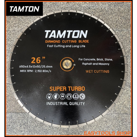 TAMTON ใบเพชรตัดคอนกรีต 26 นิ้ว หนา 4.5 มม. รูเพลา 60 มม. (มาพร้อมแหวนลดเหลือ 1 นิ้ว) ใบตัดแบบตัดน้ำ (Diamond Cutting Blade Long Life) ออกแบบมาสำหรับงานตัดหนักระดับมืออาชีพ ทั้งงานถนน งานก่อสร้าง และงานโครงสร้างคอนกรีตเสริมเหล็ก ให้การตัดที่รวดเร็ว เรียบเนียน และยืดอายุการใช้งานของใบตัดได้อย่างยอดเยี่ยม