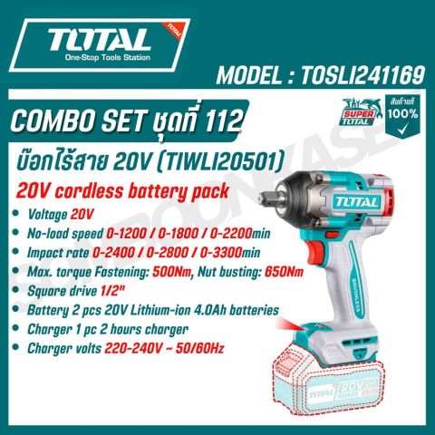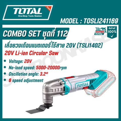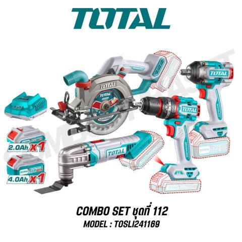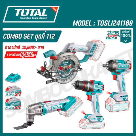 สัมผัสประสบการณ์การทำงานช่างแบบมืออาชีพด้วย Total COMBO SET ชุดที่ 112 รุ่น TOSLI241169 ชุดคอมโบเครื่องมือไร้สาย 20V ครบเซ็ต 4 ชิ้น ที่รวมสว่านกระแทกไร้สาย บ๊อกไร้สาย เลื่อยวงเดือน และเครื่องตัด-ขัดเอนกประสงค์ไว้ในชุดเดียว จัดเต็มพลัง แบตเตอรี่ 20V 4.0Ah ใช้งานข้ามวัน พร้อมออกใบกำกับภาษีได้ เหมาะทั้งช่างมืออาชีพและสาย DIY ที่ต้องการความคุ้มค่าและความสะดวกสูงสุด