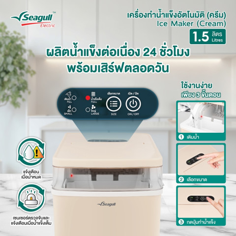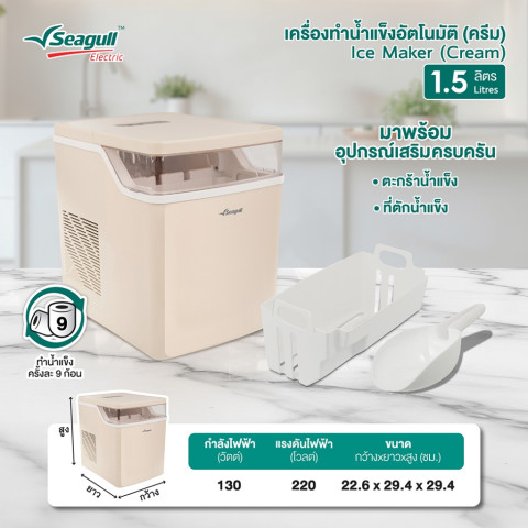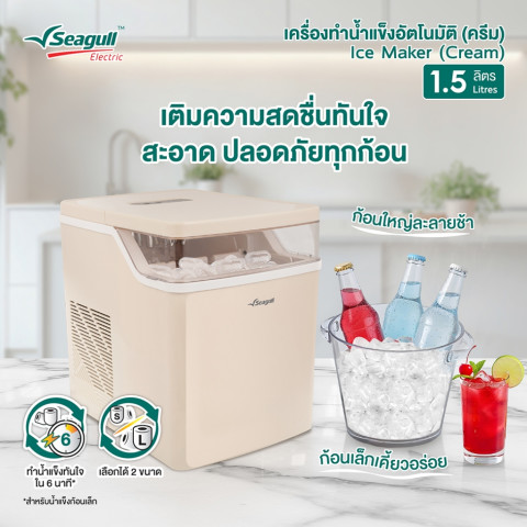เติมความเย็นให้ทุกโมเมนต์ได้ง่ายๆ ที่บ้านด้วย Seagull เครื่องทำน้ำแข็งอัตโนมัติ 1.5 ลิตร (สีครีม) ดีไซน์กะทัดรัด เรียบหรู เข้ากับทุกมุมห้องครัว บาร์เครื่องดื่ม หรือโฮมออฟฟิศ มาพร้อมฟังก์ชันทันสมัย ใช้งานง่าย เหมาะสำหรับทุกบ้านที่ต้องการน้ำแข็งสดใหม่พร้อมเสิร์ฟตลอดวัน