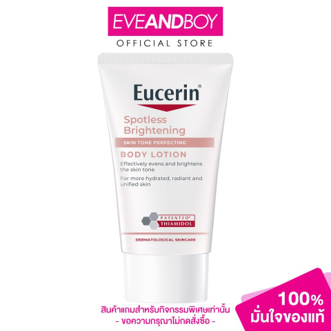 EUCERIN Spotless Brightening Skin Tone Perfecting Body Lotion ขนาดพกพา 20 มล. โลชั่นบำรุงผิวกายสูตรช่วยลดเลือนจุดด่างดำและปรับสีผิวให้ดูสม่ำเสมอ เปล่งประกายอย่างเป็นธรรมชาติ เนื้อโลชั่นบางเบา ซึมซาบไว ไม่เหนียวเหนอะหนะ เหมาะสำหรับผู้ที่ต้องการดูแลผิวหมองคล้ำให้ดูกระจ่างใสขึ้นอย่างอ่อนโยน