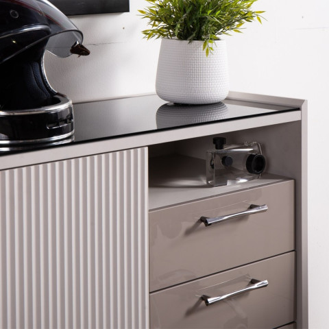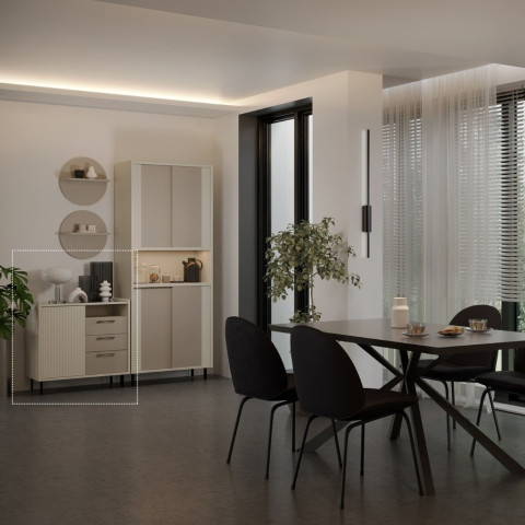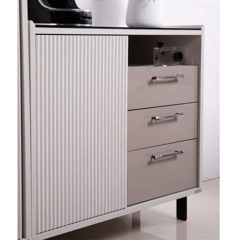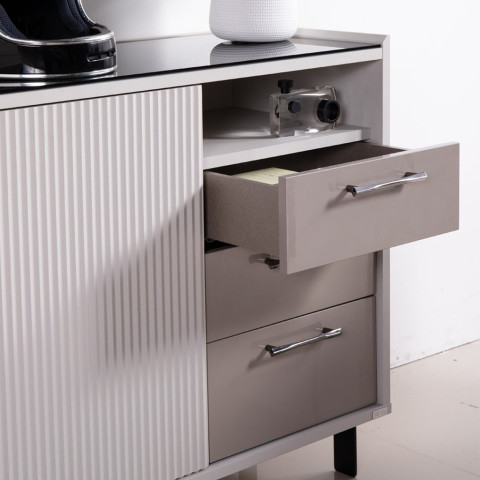ตัวตู้ขนาดกะทัดรัด 80x40x77 ซม. ออกแบบมาเพื่อจัดเก็บของได้อย่างคุ้มค่าพื้นที่ ใช้ได้ทั้งในห้องนอน ห้องแต่งตัว หรือมุมแต่งบ้าน โทนสี Almond Beige ให้ความรู้สึกอบอุ่นสบายตา ผสานดีเทล V-Cut สี Magic Grey เพิ่มมิติให้เฟอร์นิเจอร์ดูแพงขึ้นทันที ในขณะที่ท็อปด้านบนเป็น กระจกสีชาดำ Smoked Glass ช่วยเสริมความหรูหราและทำให้การตกแต่งดูโมเดิร์นขึ้นอีกระดับ