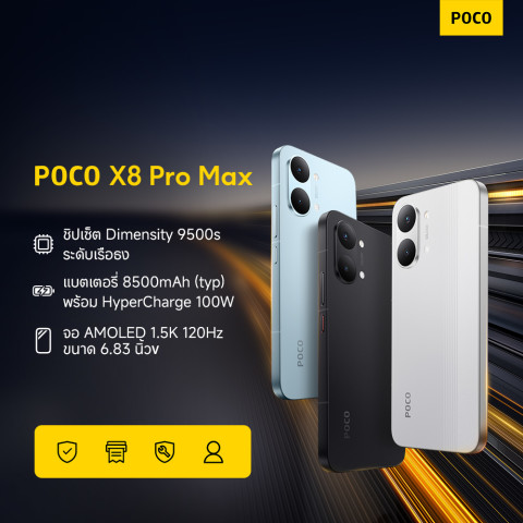 ด้านการออกแบบ POCO X8 PRO MAX มาพร้อมดีไซน์ทันสมัย บางเฉียบ จับถือถนัดมือ ตัวเครื่องแข็งแรงทนทาน ให้สัมผัสพรีเมียม เหมาะทั้งการใช้งานจริงจังและไลฟ์สไตล์ในทุกวัน ครบทั้งความแรง ความอึด และความสวยในเครื่องเดียว