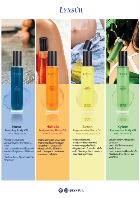 Lyxsúil The Art Of Skin Conditioning คือเซ็ตบอดี้ออยล์ระดับพรีเมียมสำหรับคนรักการบำรุงผิวแบบ “ปรับให้เหมาะกับผิวในแต่ละวัน” ด้วยเนื้อออยล์ที่ซึมสบาย ช่วยเติมความชุ่มชื้น ฟื้นบำรุงผิวให้ดูนุ่มลื่น มีสุขภาพดี และมอบสัมผัสผิวโกลว์อย่างเป็นธรรมชาติ เหมาะทั้งหลังอาบน้ำ ก่อนนอน หรือใช้ผสมกับโลชั่นเพื่อเพิ่มพลังการบำรุง