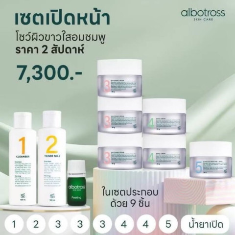 Albotross set สุดคุ้ม เซตเปิดหน้าสวยสุดคุ้ม เซตพลัดเซลล์ผิวหน้าแบบครบขั้นตอน ช่วยเคลียร์ผิวหมองคล้ำ ลดเลือนฝ้า กระ จุดด่างดำ และเผยผิวใหม่ที่ดูเรียบเนียน กระจ่างใสขึ้น เหมาะสำหรับผู้ที่อยากเริ่มดูแลผิวอย่างจริงจังด้วยเซตเดียวจบ