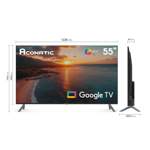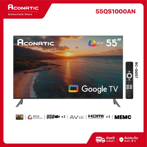 (NEW 2025) Aconatic ทีวี 55 นิ้ว QLED 4K Google TV รุ่น 55QS1000AN ยกระดับความบันเทิงในบ้านให้เหมือนโรงภาพยนตร์ ด้วยจอ QLED 55" ความละเอียด UHD 4K (3840×2160) ให้ภาพคมชัด สีสันสดใสเป็นธรรมชาติด้วย Wide Color Gamut DCI-P3 94% พร้อมรองรับ HDR และเทคโนโลยี Dolby Vision เพื่อมิติภาพที่สวยลึกสมจริง ควบคู่เสียงกระหึ่มรอบทิศทางด้วย Dolby Atmos และลำโพงคู่ 15W+15W ใช้งานง่ายด้วย Google TV โหลดแอปจาก Google Play ได้ครบ รองรับ Netflix, YouTube และสตรีมมิ่งยอดนิยม พร้อม Voice Search (Google Assistant) ค้นหาคอนเทนต์ได้ทันใจ