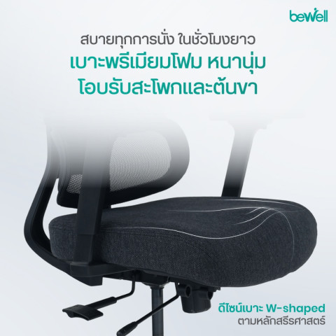 เบาะนั่ง Ergonomic ทรง W-Shape โอบรับสะโพกและต้นขา ปรับท่านั่งให้ถูกสรีระโดยอัตโนมัติ พร้อมฟังก์ชันปรับความลึกของเบาะ นั่งได้เต็มก้น ไม่กดทับข้อพับเข่า นั่งสบาย ผ่อนคลาย ลดเสี่ยงออฟฟิศซินโดรม