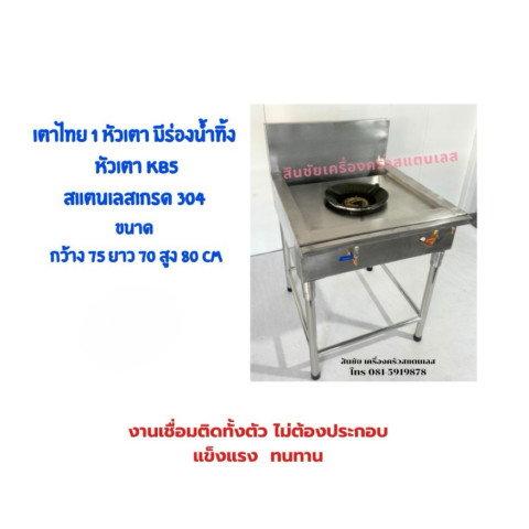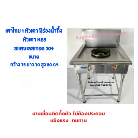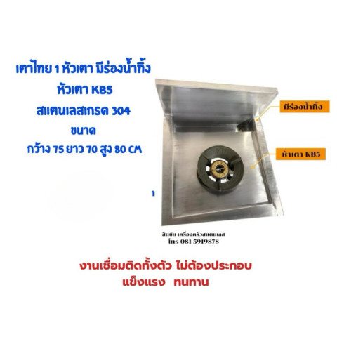 เตาไทย 1 หัวเตา มีร่องน้ำทิ้ง หัวเตา KB5 สแตนเลสแท้ 304 งานเชื่อมติดทั้งตัว ราคา 10,700.00 บาท เหมาะสำหรับร้านอาหาร ครัวบ้าน หรือครัวงานหนักที่ต้องการเตาไฟแรง โครงสร้างแข็งแรง และทำความสะอาดง่าย ด้วยงานเชื่อมติดถาวรทั้งตัว ไม่ต้องประกอบ พร้อมร่องน้ำทิ้งช่วยจัดการคราบน้ำ/เศษอาหารให้พื้นที่ครัวดูเป็นระเบียบมากขึ้น