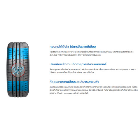 ใช้วัสดุหน้ายางรุ่นใหม่แบบ Hybrid Belt เพิ่มหน้าสัมผัสยางกับพื้นถนน กระจายแรงกดสม่ำเสมอ ทำให้พวงมาลัยตอบสนองไว เข้าโค้งมั่นคง และเบรกมั่นใจมากขึ้นประหยัดพลังงาน ช่วยถนอมแบตเตอรี่