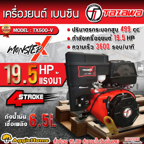 TAZAWA เครื่องยนต์เบนซิน 4 จังหวะ รุ่น (Recail Start) Monster X TX500-V 19.5 ขุมพลังอเนกประสงค์สำหรับงานเกษตร งานช่าง และงานขับเคลื่อนอุปกรณ์ต่าง ๆ ให้แรงม้าจัดเต็ม 19.5 แรงม้า พร้อมระบบ มือดึงสตาร์ท ใช้งานง่าย ติดตั้งได้หลากหลาย เหมาะสำหรับผู้ที่ต้องการเครื่องยนต์กำลังสูง ทนทาน และพร้อมลุยงานหนักในทุกวัน