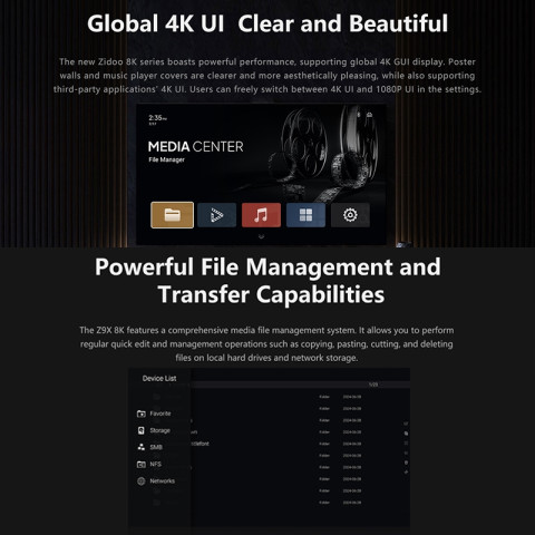Zidoo Z9X 8K รุ่นปี 2024 เครื่องเล่นไฟล์หนังประสิทธิภาพสูงสำหรับสาย Home Theater โดยเฉพาะ มาพร้อมชิปเซ็ตใหม่ Amlogic S928X-K แบบ 64-bit Penta-core (A76 + A55) และ Android 11 รองรับภาพ 8K@60Hz พร้อม HDR ครบชุด รวมถึง Dolby Vision และส่งผ่านเสียงระดับโรงภาพยนตร์ Dolby Atmos / DTS:X เพื่อประสบการณ์ดูหนังจากไฟล์ที่ลื่นไหล คมชัด และเต็มอารมณ์