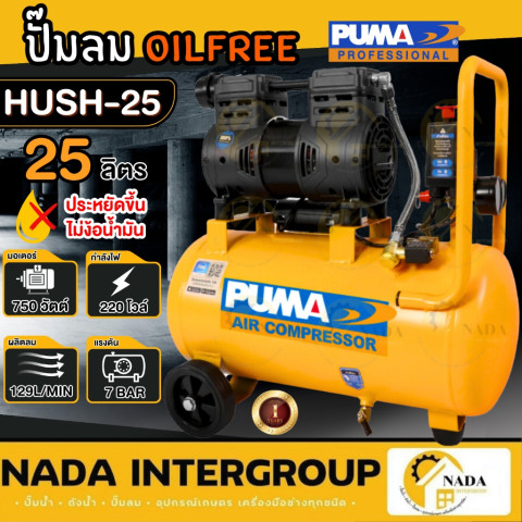 PUMA HUSH-25 ปั๊มลมไร้น้ำมัน (Oil Free) รุ่นยอดนิยมสำหรับคนที่ต้องการ “ปั๊มลมเสียงเงียบ” ใช้งานในบ้าน คอนโด หรือพื้นที่ที่ไม่ต้องการเสียงรบกวน มาพร้อมมอเตอร์ทองแดงแท้ 100% กำลัง 750W ให้ลมสม่ำเสมอ เหมาะกับงานต่อเติมบ้านและงานช่างสารพัดแบบ ใช้งานได้ทั้งเป่าฝุ่น เติมลม ยิงแม็กลม และพ่นสี (ขึ้นอยู่กับความต่อเนื่องและอุปกรณ์ที่ใช้)