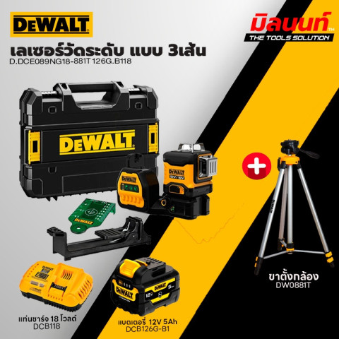 DEWALT เลเซอร์วัดระดับ 3 เส้น รุ่น DCE089NG18-XJ + ขาตั้งกล้อง + แบตเตอรี่ 12V 5Ah + แท่นชาร์จ 18V ชุดเครื่องมือมืออาชีพสำหรับงานติดตั้ง งานช่าง และงานก่อสร้าง ช่วยกำหนดแนวระดับ/แนวดิ่งได้รวดเร็วและแม่นยำด้วยเลเซอร์สีเขียวคมชัด มองเห็นง่ายทั้งในที่สว่างและที่มืด พร้อมขาตั้งปรับสูงได้ และชุดพลังงานสำหรับใช้งานได้ต่อเนื่อง คุ้มค่าในชุดเดียว ราคา 20,947.00 บาท