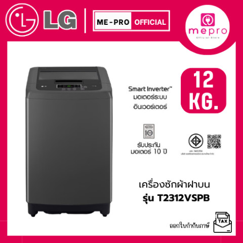 LG เครื่องซักผ้าฝาบน 12 กก. รุ่น T2312VSPB (Smart Inverter) สีดำ เครื่องซักผ้าราคาคุ้มที่ให้ทั้งพลังซักสะอาดและการถนอมผ้าในเครื่องเดียว ซักได้จุใจ 12 กก. เหมาะกับครอบครัวหรือคนซักผ้าปริมาณมาก มาพร้อมมอเตอร์ Smart Inverter ที่ทำงานเงียบ ลดแรงสั่นสะเทือน และประหยัดพลังงาน ช่วยให้ทุกวันซักผ้าเป็นเรื่องง่าย สะอาดเร็วทันใจ พร้อมรับประกันศูนย์แท้