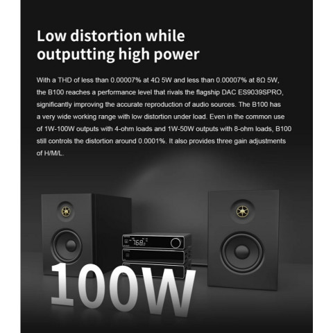THD+N < 0.00008% และ THD < 0.00007% (ที่ 4Ω 5W / 8Ω 5W) ถ่ายทอดโทนเสียงได้เที่ยงตรง ลดความผิดเพี้ยนที่ทำให้เสียงแข็งหรือแบนกำลังขับสูงสำหรับลำโพงพาสซีฟ