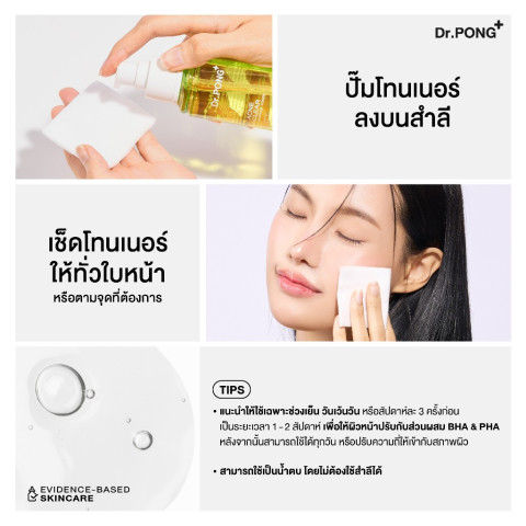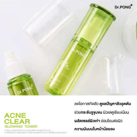Dr.PONG Acne Clear Glowing Toner โทนเนอร์สูตรอ่อนโยนสำหรับคนเป็นสิวและผิวแพ้ง่าย ช่วยดูแลปัญหาสิวแบบครบด้าน ทั้งเช็ดทำความสะอาดหลังล้างหน้า พร้อมผลัดเซลล์ผิวเก่าอย่างนุ่มนวล ควบคุมความมัน และช่วยให้รูขุมขนแลดูกระชับ ผิวดูใสเรียบเนียนขึ้นแบบไม่ทำร้ายผิว เหมาะสำหรับใช้เป็นประจำทุกวัน