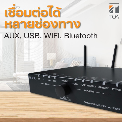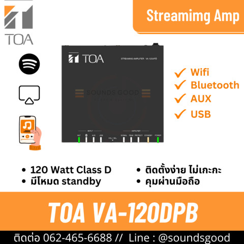 TOA VA-120DPB เพาเวอร์แอมป์กำลังขับ 120W สำหรับงานระบบเสียง BGM คุณภาพสูง รองรับทั้งการขับลำโพงแบบ 100V Line และแบบ 4 โอห์ม ในเครื่องเดียว เหมาะสำหรับโรงแรม ร้านอาหาร ร้านค้าปลีก คาเฟ่ ออฟฟิศ หรือพื้นที่ที่ต้องการเสียงเพลงคมชัดต่อเนื่อง พร้อมฟังก์ชันสตรีมมิ่งครบครันด้วย Wi‑Fi 2.4G และ Bluetooth 5.0 ให้คุณเปิดเพลงจากแอปและบริการออนไลน์ได้สะดวก พร้อมรองรับการเล่นแบบหลายห้อง (Multiroom/Multizone)