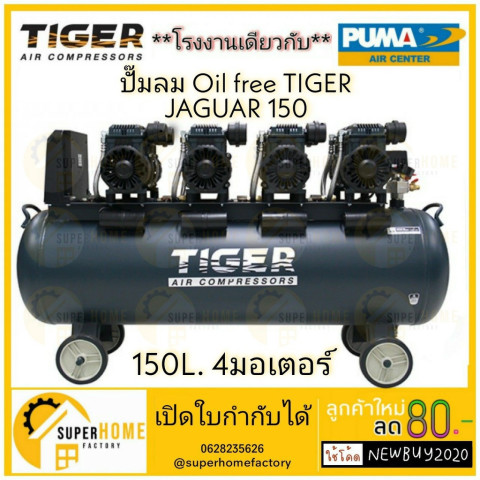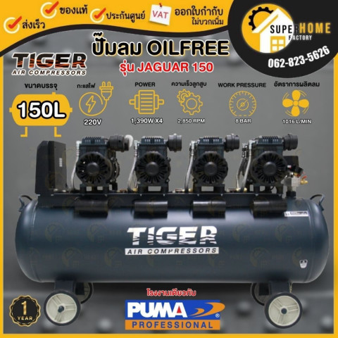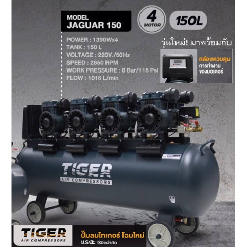 💥แท้ ส่งด่วน💥 TIGER ปั๊มลม JAGUAR-150 แบบไม่ใช้น้ำมัน (Oil Free) ถัง 150 ลิตร รุ่นเงียบ เหมาะสำหรับงานช่างและงานใช้งานต่อเนื่องที่ต้องการลมแรงสม่ำเสมอ พร้อมถังขนาดใหญ่ 150L ช่วยสำรองลมได้มาก ใช้งานได้อเนกประสงค์ทั้งในบ้าน ร้านซ่อม เวิร์กช็อป และงานบริการต่างๆ โดยไม่ต้องกังวลเรื่องน้ำมันหล่อลื่น ลดกลิ่นและคราบเลอะเทอะจากน้ำมัน