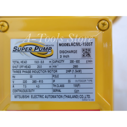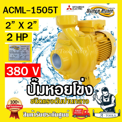 MITSUBISHI SUPER PUMP ปั๊มน้ำหอยโข่ง 2" x 2" 2HP 380V รุ่น ACML-1505T ปั๊มหอยโข่งแรงดันสูงปานกลาง (Medium Head) ที่ออกแบบมาให้ กินกระแสต่ำ เสียงเงียบ และดูดน้ำได้ไกล เหมาะสำหรับงานสูบน้ำต่อเนื่อง งานเกษตร ระบบสปริงเกอร์ งานอุตสาหกรรม หรือการจ่ายน้ำในพื้นที่ที่แหล่งน้ำอยู่ไกล/ระดับน้ำต่ำ ด้วยการออกแบบค่า NPSH ต่ำ ช่วยคงอัตราการไหลได้ดี ใช้งานคุ้มค่าและประหยัดพลังงานยิ่งขึ้นในแบบ ECO Model