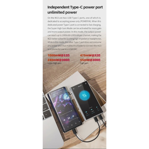 มี USB Type-C 2 พอร์ต (หนึ่งพอร์ตสำหรับรับไฟเท่านั้น) เมื่อใช้ร่วมกับการชาร์จเร็ว จะเปิด Super High Gain ได้ เพื่อดันกำลังขับให้สูงขึ้น เหมาะกับหูฟังอิมพีแดนซ์สูง และยังสามารถต่อเป็น USB DAC ได้สะดวกรองรับการฟังแบบไร้สาย/สตรีมมิ่งครบ